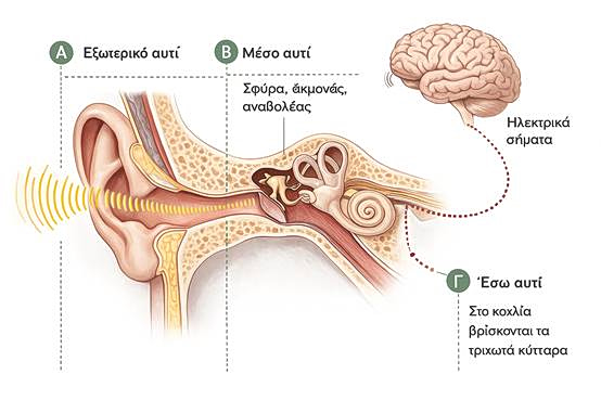 Το σύστημα της ακοής αποτελείται από τρία κύρια τμήματα: