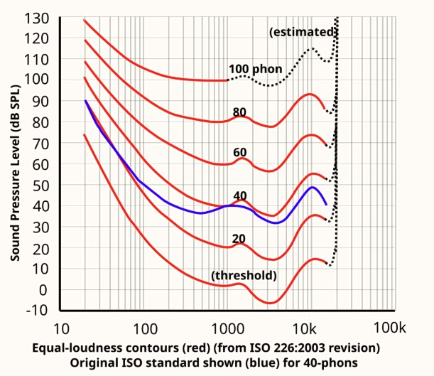 - Όταν η ένταση αυξάνει: Οι χαμηλές συχνότητες γίνονται προοδευτικά πιο ακουστές, ενώ οι υψηλές δεν ενισχύονται τόσο. Η καμπύλη ακουστότητας “ισιώνει” δηλαδή οι διαφορές ανάμεσα σε χαμηλές και υψηλές μειώνονται.