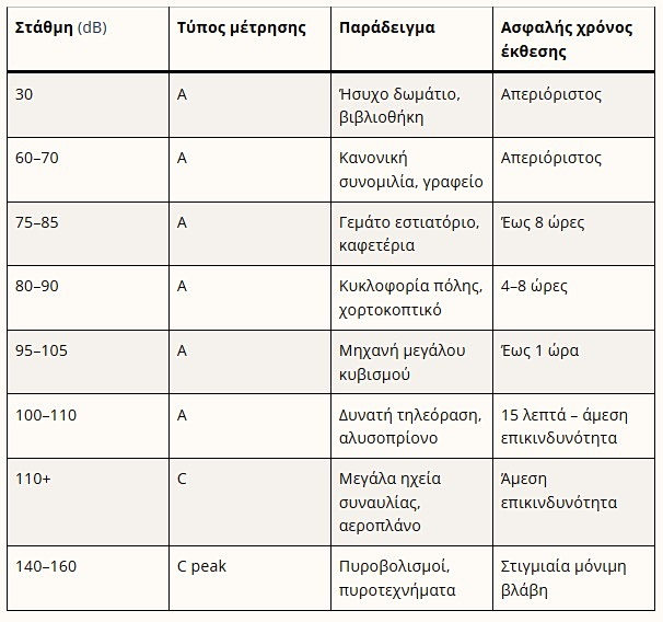 - Χώροι εργασίας (8ωρη έκθεση): έως 85 dB(A)