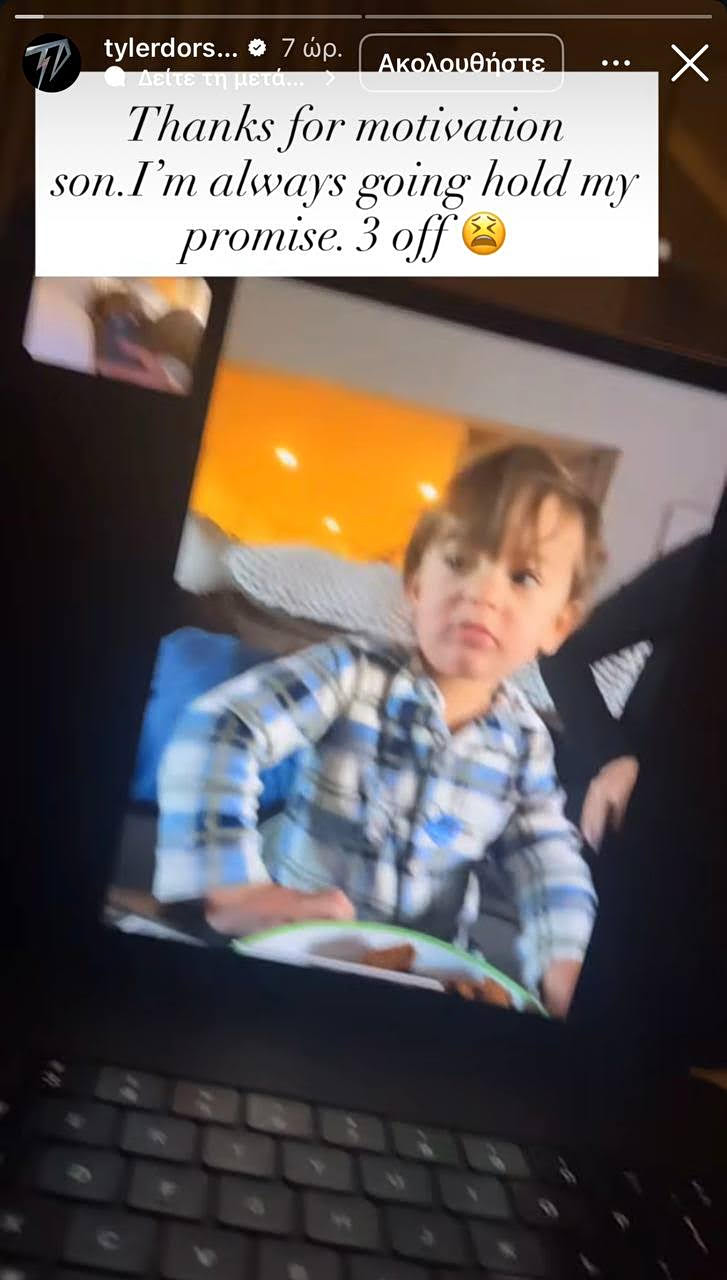 Συγκεκριμένα, ο Ντόρσεϊ δημοσίευσε ένα συγκινητικό story στο Ιnstagram με τη φωτογραφία του γιου του, Σάιλο και έγραψε: «Σε ευχαριστώ για το κίνητρο, θα κρατήσω την υπόσχεσή μου. Μου έλειπαν 3 πόντοι».