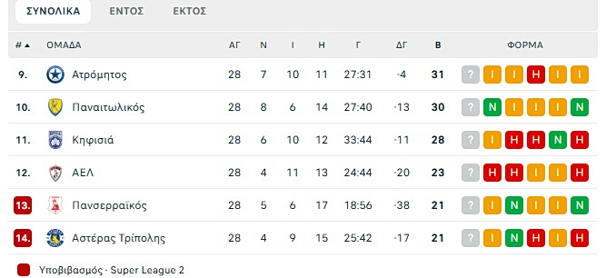 Μετά το πέρας της 2ης αγωνιστικής των playouts της Stoiximan Super League, Πανσερραϊκός και Αστέρας Τρίπολης AKTOR παραμένουν μαζί στον βαθμολογικό πίνακα.