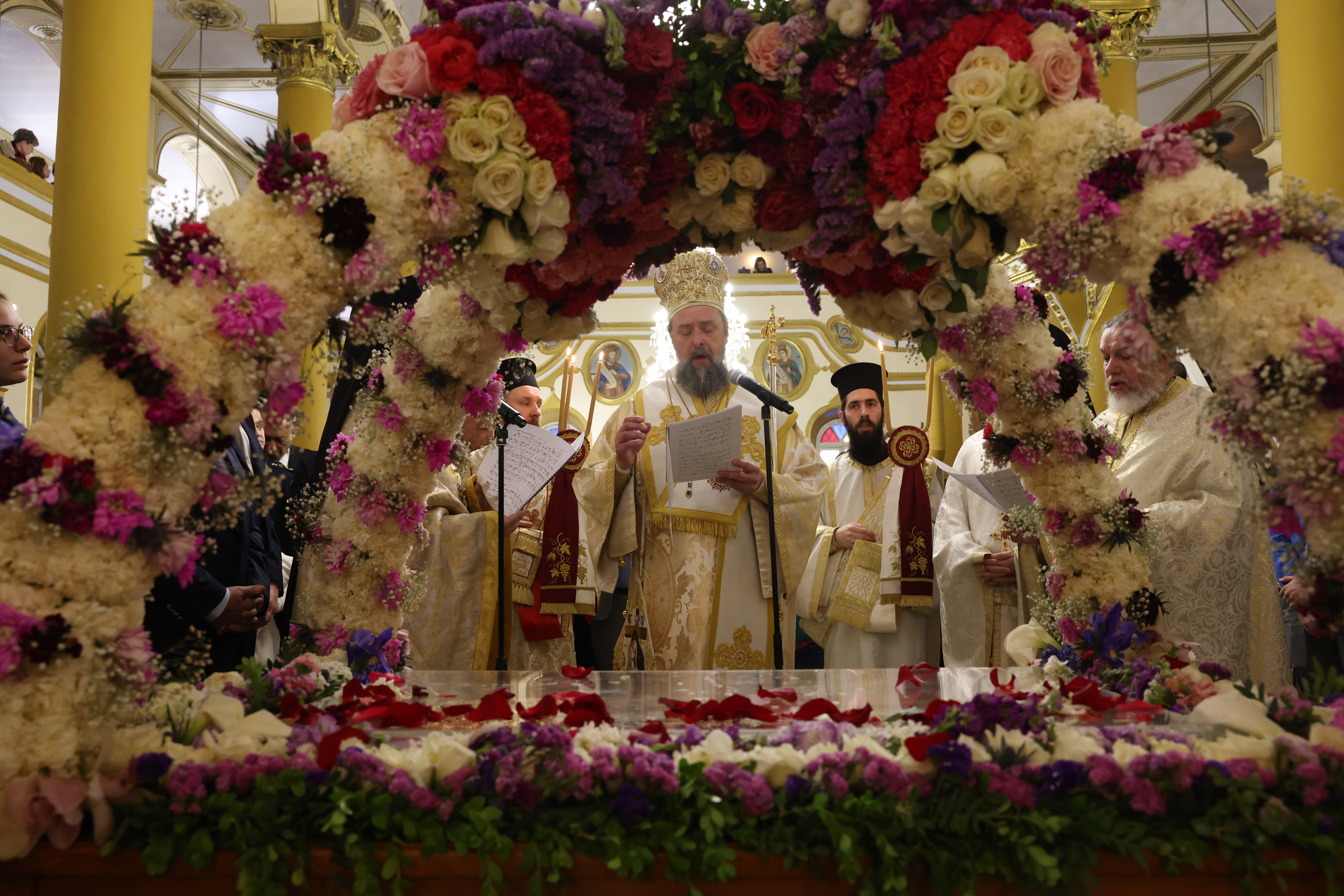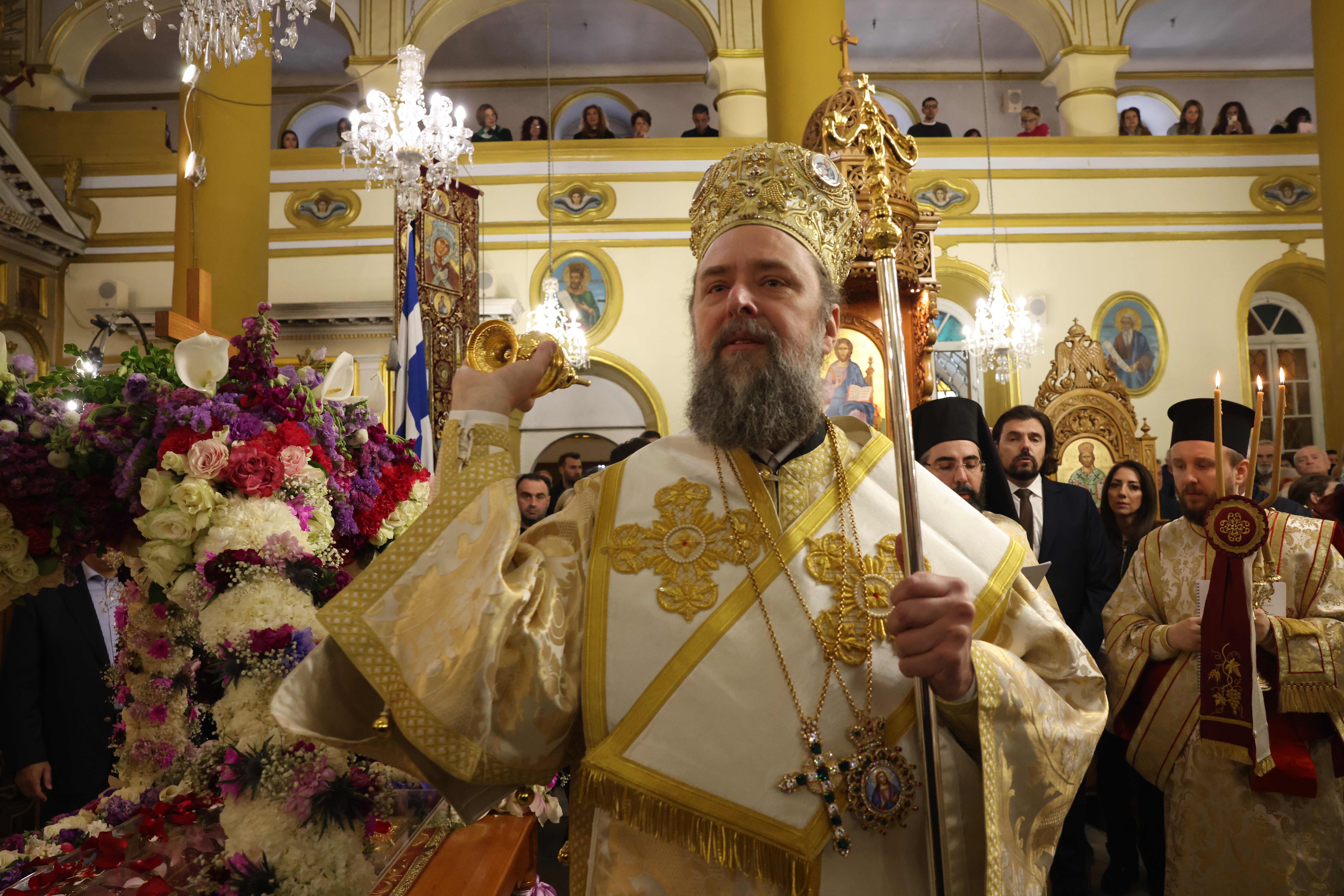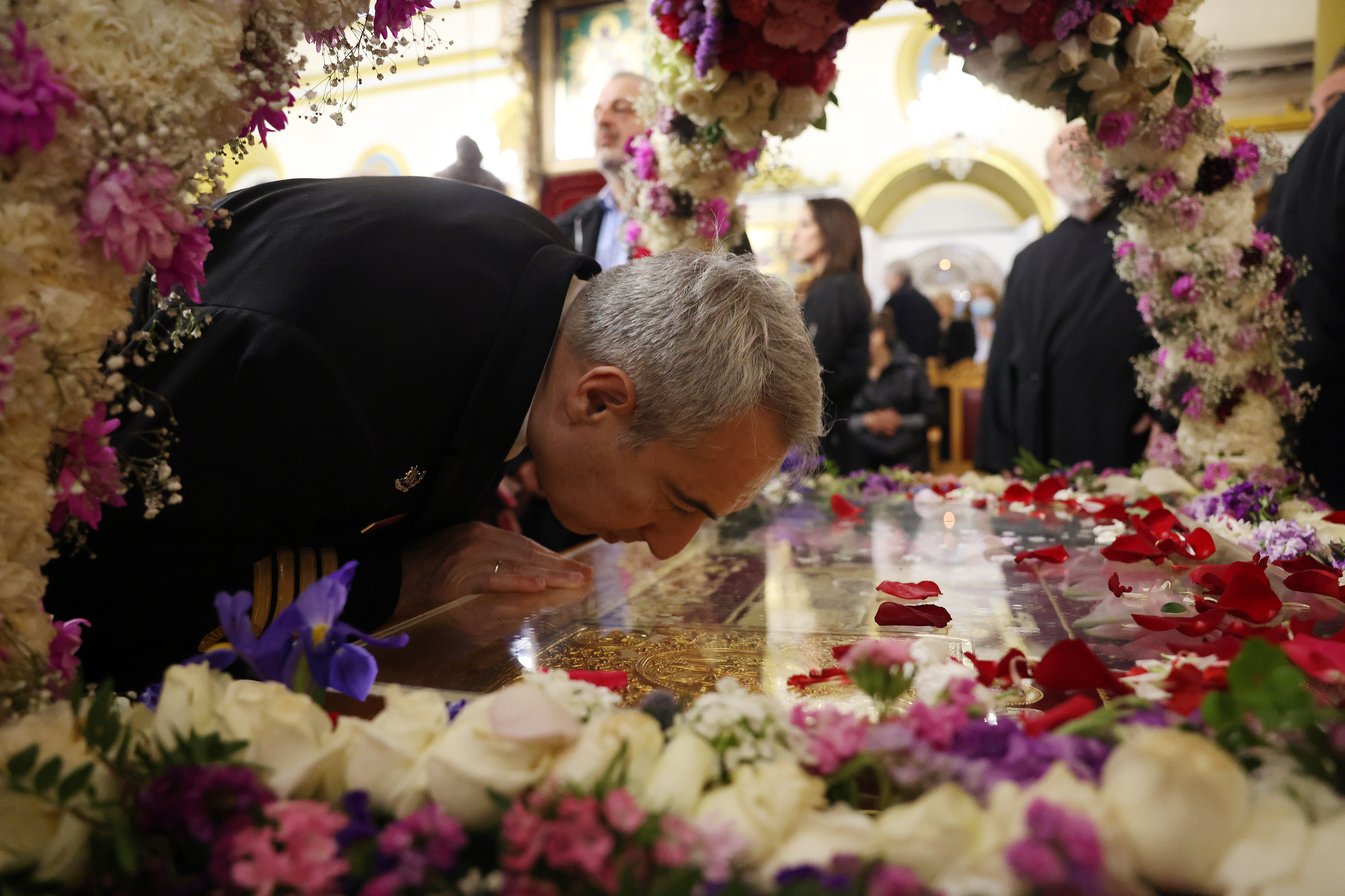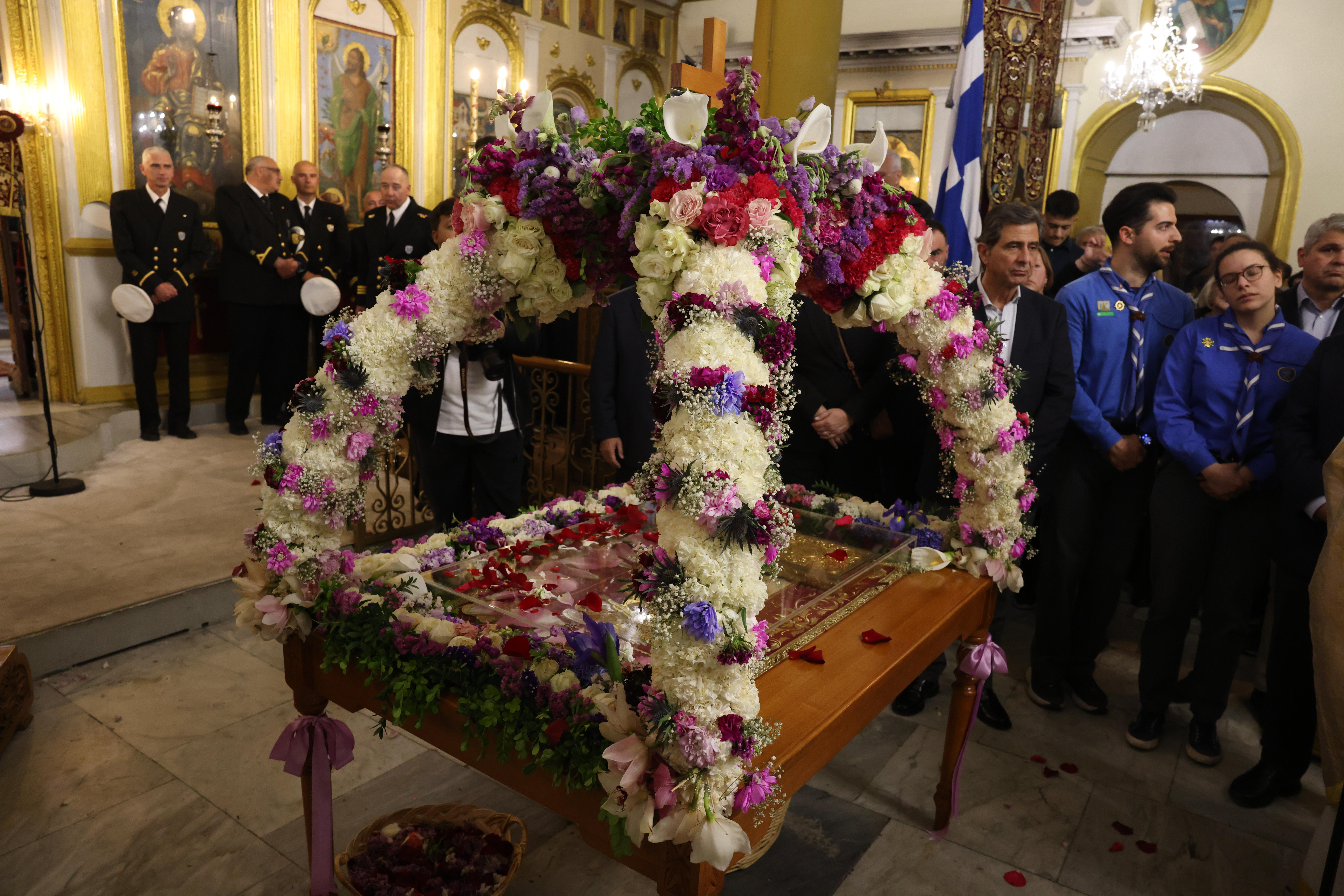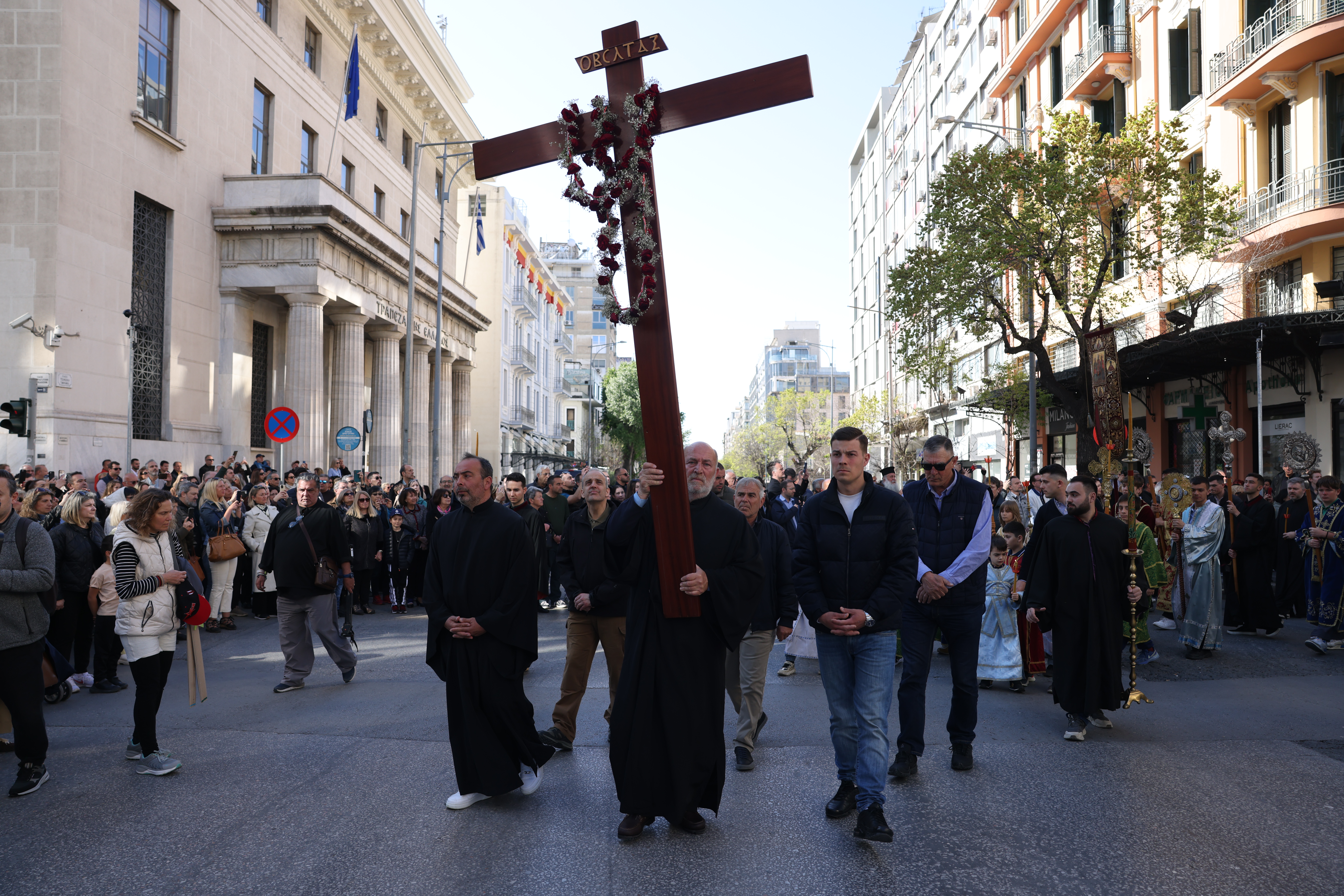 Μυροφόρες έραιναν τον Επιτάφιο με άνθη, ενώ αξιωματικοί του Ναυτικού τον μετέφεραν, πλαισιωμένοι από προσκόπους και μέλη του Ερυθρού Σταυρού. Το πλήθος των πιστών ακολούθησε την πομπή, με τις καμπάνες να ηχούν πένθιμα σε όλο το κέντρο της πόλης.