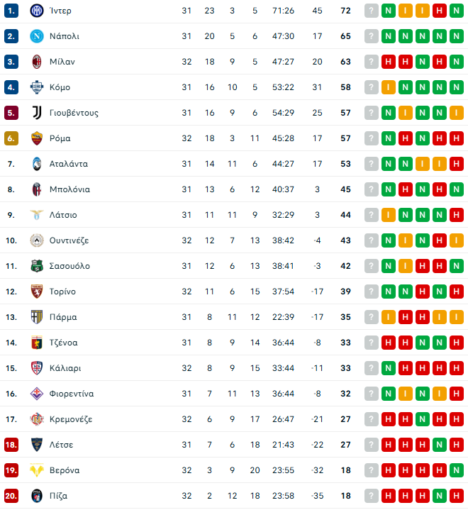 Η βαθμολογία της Serie A
