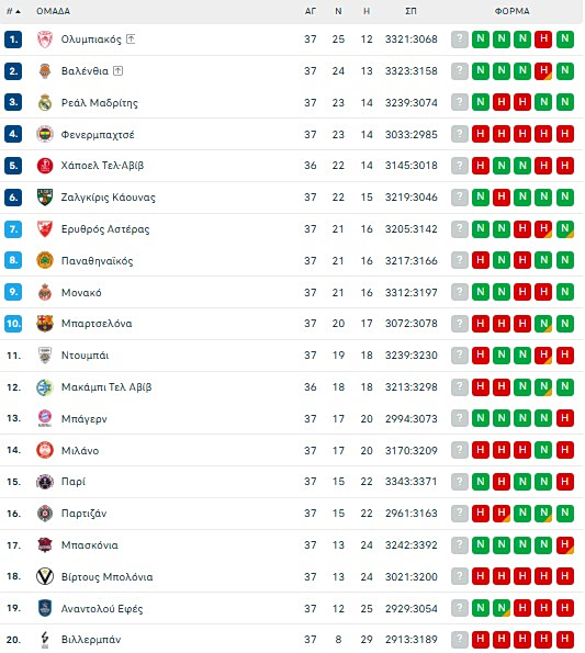 Φυσικά, το ενδιαφέρον είναι στις ελληνικές ομάδες. Οι «ερυθρόλευκοι» βρίσκονται στο… ρετιρέ της βαθμολογίας και οι «πράσινοι» παλεύουν για να αποφύγουν τα play in και να μπουν στην εξάδα.