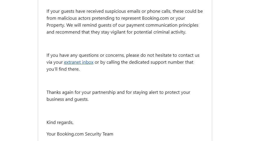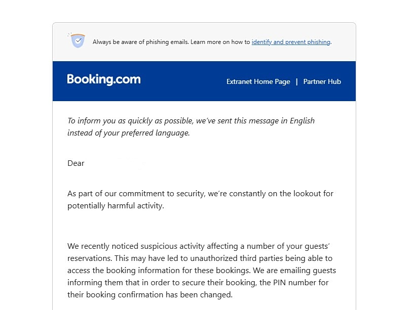 Παράλληλα, συνιστάται προσοχή σε πιθανά μηνύματα που μπορεί να σταλούν καθώς έχουν ήδη καταγραφεί αναφορές για e-mails που εμφανίζονται ως επίσημες ειδοποιήσεις της Booking.com για αλλαγή PIN ενώ δεν υπάρχει καμία κράτηση. Δεν είμαστε σε θέση να επιβεβαίωσουμε αν η εταιρεία έστειλε το μήνυμα και σε παλαιότερους χρήστες για λόγους ασφαλείας.