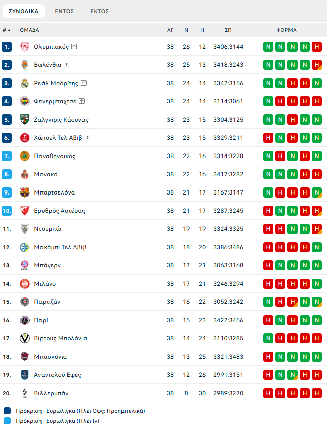 Η τελική βαθμολογία μετά από 38 αγωνιστικές