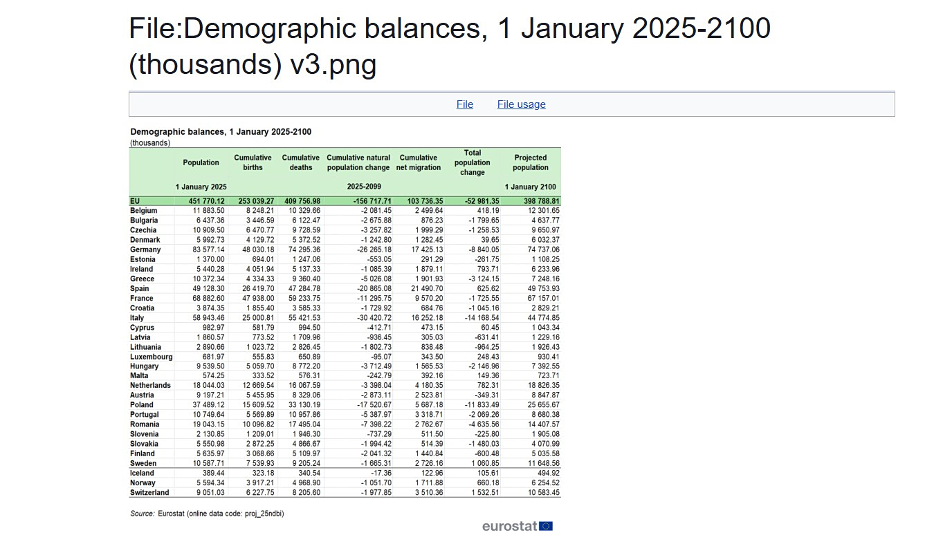 Σύμφωνα με τα στοιχεία, ο συνολικός πληθυσμός της Ευρωπαϊκής Ένωσης εκτιμάται ότι θα μειωθεί από περίπου 451 εκατομμύρια σήμερα σε περίπου 398 εκατομμύρια μέχρι το 2100. Παράλληλα, η ηλικιακή σύνθεση αλλάζει αισθητά: το ποσοστό των παιδιών και νέων (0–19 ετών), που σήμερα βρίσκεται γύρω στο 20%, προβλέπεται να υποχωρήσει στο 17%, ενώ ο πληθυσμός μεγαλύτερης ηλικίας θα αυξηθεί σημαντικά, εντείνοντας το φαινόμενο της γήρανσης.