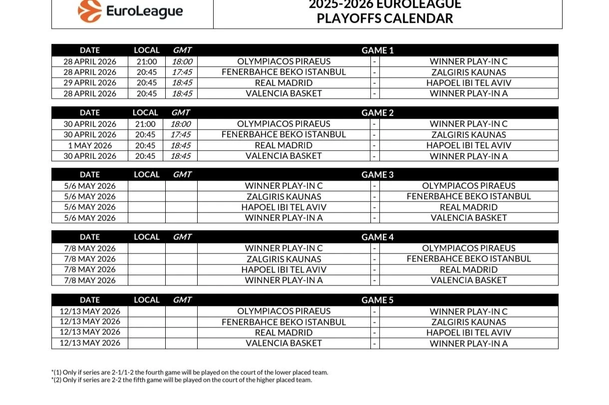 Οι αγώνες για τα playoffs της EuroLeague θα ξεκινήσουν στις 28 Απριλίου, με την ανακοίνωση της διοργανώτριας αρχής να φέρνει το πρόγραμμα των δύο πρώτων αναμετρήσεων, που θα κρίνουν ποιες ομάδες θα καταφέρουν να εξασφαλίσουν την πρόκριση στο Final Four, το οποίο θα φιλοξενηθεί στο Telekom Center Athens.