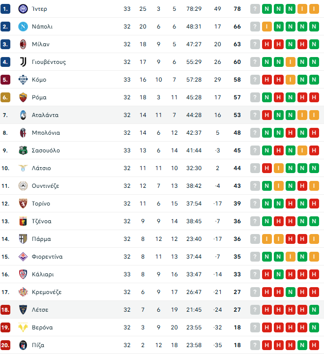 Η βαθμολογία της Serie A