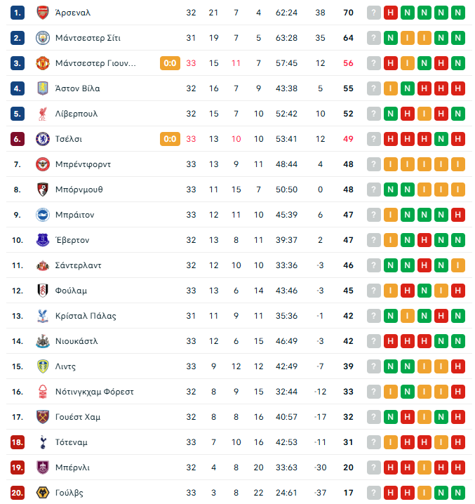 Η βαθμολογία της Premier League