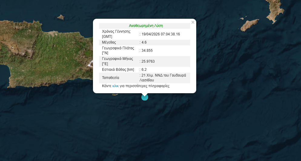 Σεισμική δόνηση μεγέθους 4,6 βαθμών της κλίμακας Ρίχτερ σημειώθηκε στις 19 Απριλίου 2026, στις 10:04 το πρωί, σύμφωνα με τα στοιχεία του Γεωδυναμικού Ινστιτούτου.