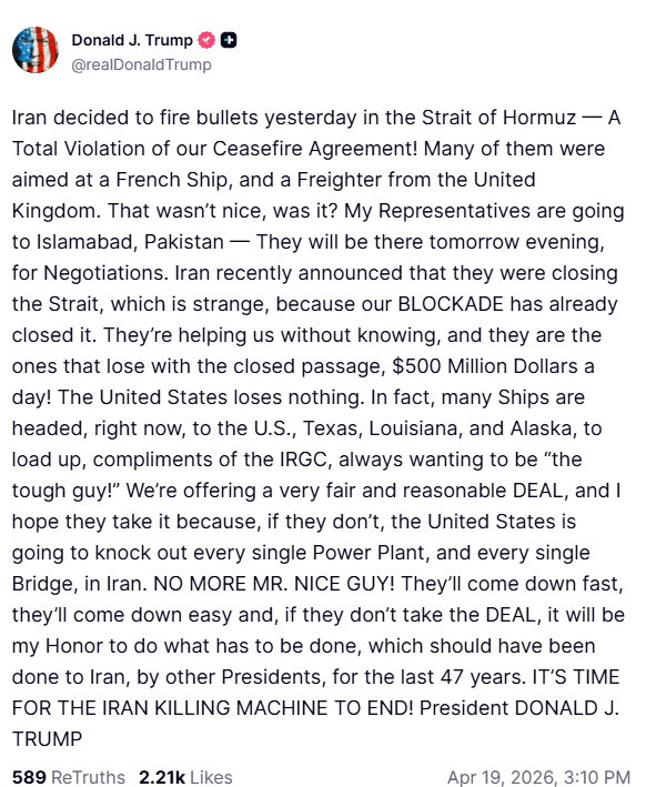 Ο Τραμπ σημείωσε ότι εκπρόσωποί του πρόκειται να μεταβούν στο Ισλαμαμπάντ του Πακιστάν για διαπραγματεύσεις, ενώ υπογράμμισε πως το Ιράν είχε ανακοινώσει το κλείσιμο των Στενών, «γεγονός παράδοξο, καθώς η αμερικανική αποκλειστική ζώνη τα έχει ήδη κλείσει».