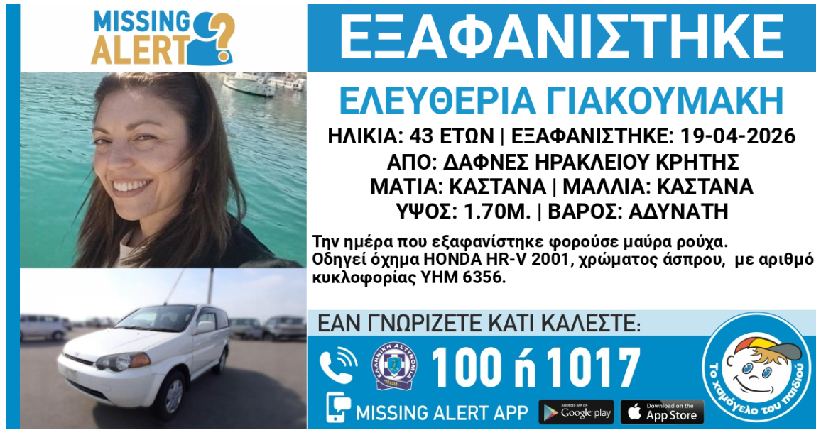 Η 43χρονη, μητέρα τριών παιδιών, φέρεται να έφυγε από το σπίτι της τις πρωινές ώρες της Κυριακής με το αυτοκίνητό της και έκτοτε δεν έχει δώσει σημεία ζωής. Σύμφωνα με πληροφορίες του cretalive.gr, το απόγευμα της ίδιας ημέρας έστειλε μήνυμα στον γιο της ότι θα επικοινωνήσει μαζί του αργότερα, κάτι που τελικά δεν συνέβη.