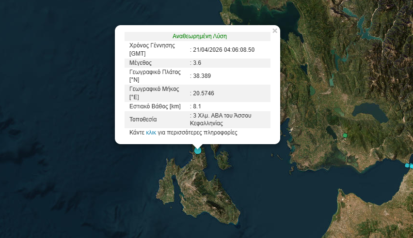 Σεισμική δόνηση μεγέθους 3,6 βαθμών της κλίμακας Ρίχτερ σημειώθηκε το πρωί της 21ης Απριλίου 2026 στην περιοχή της Κεφαλονιάς.