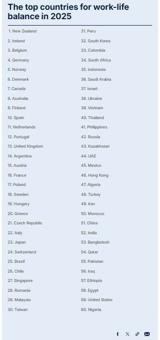 Η Νέα Ζηλανδία αναδείχθηκε η χώρα με την καλύτερη ισορροπία μεταξύ επαγγελματικής και προσωπικής ζωής για το 2026, σύμφωνα με τη νέα έρευνα Global Life-Work Balance Index 2025. O Δείκτης έλαβε υπόψη παράγοντες όπως οι ημέρες άδειας, η πρόσβαση στην υγειονομική περίθαλψη, η δημόσια ασφάλεια και οι μέσες ώρες εργασίας ανά εβδομάδα. Στην κορυφή βρέθηκαν χώρες με ιδιαίτερα γενναιόδωρες πολιτικές για άδειες και παροχές προς τους εργαζόμενους. Στην 20η θέση της λίστας που παρουσιάζει η Daily Mail είναι η Ελλάδα.