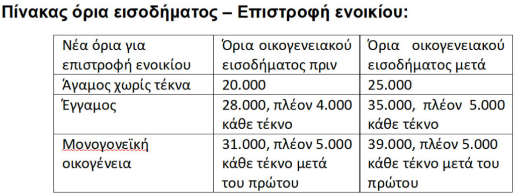 Από 20.000 σε 25.000 ευρώ και από 28.000 σε 35.000 ευρώ, ενώ για τις μονογονεϊκές οικογένειες το όριο ανεβαίνει από 31.000 σε 39.000 ευρώ, με προσαύξηση 5.000 ευρώ ανά τέκνο.