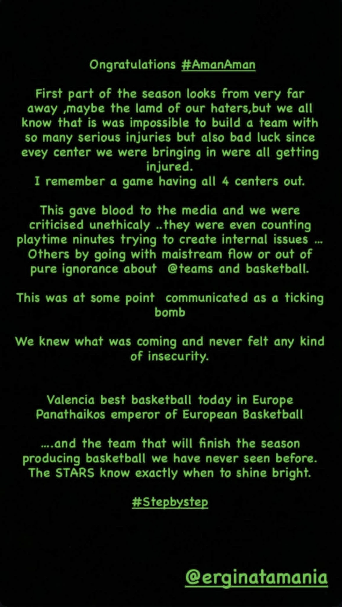 Η Βαλένθια παίζει το καλύτερο μπάσκετ σήμερα στην Ευρώπη. Ο Παναθηναϊκός είναι ο κυρίαρχος του ευρωπαϊκού μπάσκετ και η ομάδα που θα τελειώσει τη σεζόν παίζοντας μπάσκετ που δεν θα έχουμε ξαναδεί. Τα ΑΣΤΕΡΙΑ ξέρουν πότε πρέπει να λάμψουν. Βήμα βήμα».