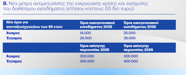 Για τους άγαμους ή όσους βρίσκονται σε χηρεία, το εισοδηματικό πλαφόν ανεβαίνει στις 25.000 ευρώ ετησίως, ενώ για τα ζευγάρια το όριο φτάνει τις 35.000 ευρώ. Αντίστοιχα γενναία είναι και η αύξηση στα περιουσιακά κριτήρια, με την ακίνητη περιουσία να μπορεί να αγγίζει πλέον τις 300.000 και 400.000 ευρώ αντίστοιχα. Στην πράξη, αυτό σημαίνει πως ένας συνταξιούχος με μηνιαίες αποδοχές ακόμα και πάνω από 2.000 ευρώ μικτά, φέτος θα δει το επίδομα στον λογαριασμό του.