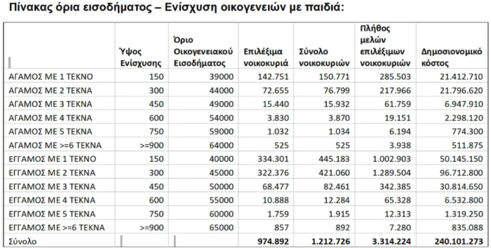 Για τους άγαμους γονείς, το όριο εισοδήματος ξεκινά από τις 39.000 ευρώ για ένα παιδί και αυξάνεται κατά 5.000 ευρώ για κάθε επιπλέον τέκνο, φτάνοντας για παράδειγμα τις 44.000 ευρώ για δύο παιδιά με ενίσχυση 300 ευρώ, ή τις 64.000 ευρώ για έξι παιδιά και άνω με το ποσό να ξεπερνά τα 900 ευρώ.