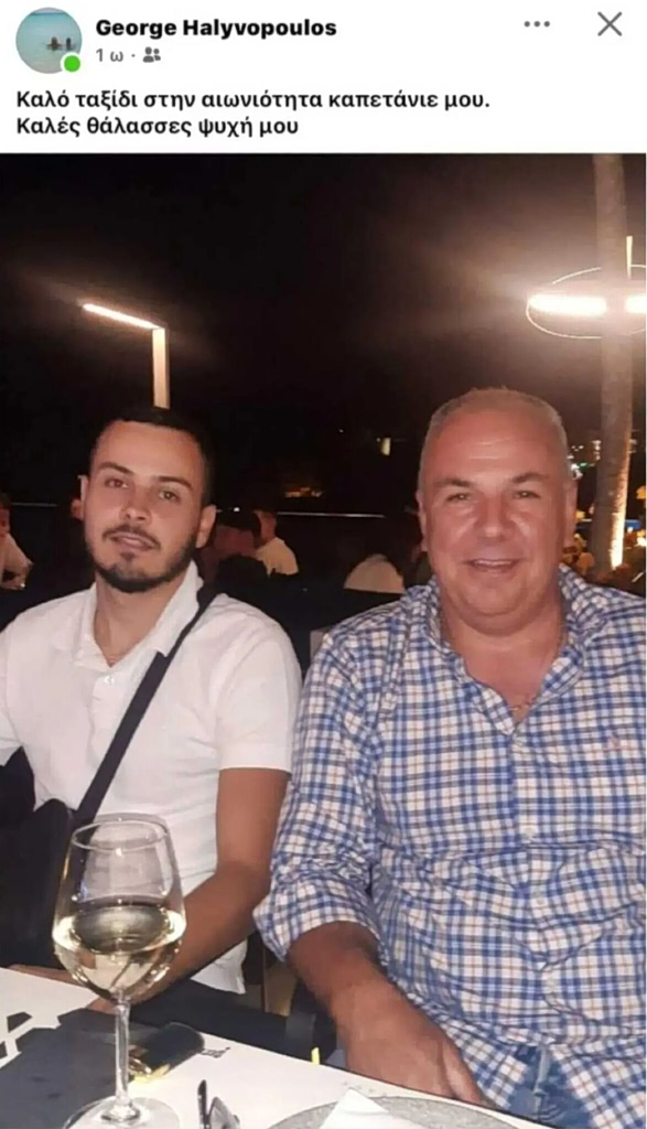 Το πρωί της Πέμπτης, με μια σπαρακτική ανάρτηση, ο ταξίαρχος της ΕΛ.ΑΣ. αποχαιρέτησε τον 27χρονο γιο του: «Καλό ταξίδι στην αιωνιότητα καπετάνιε μου. Καλές θάλασσες ψυχή μου», έγραψε ο αξιωματικός σε ανάρτησή του στα μέσα κοινωνικής δικτύωσης, συνοδεύοντας τα λόγια του με μια κοινή τους φωτογραφία.