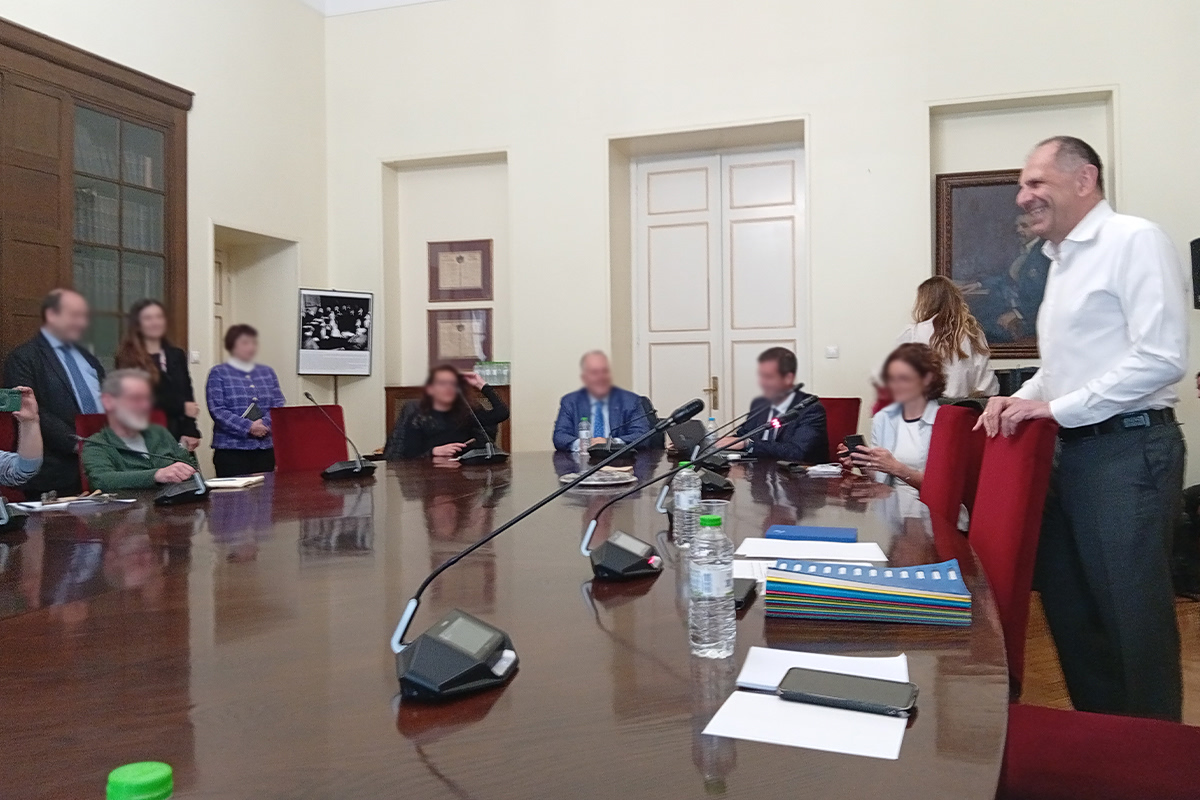 Η παρουσία του διέκοψε για λίγα λεπτά τη διαδικασία, δημιουργώντας ευχάριστο κλίμα μεταξύ των δημοσιογράφων και των στελεχών του υπουργείου.