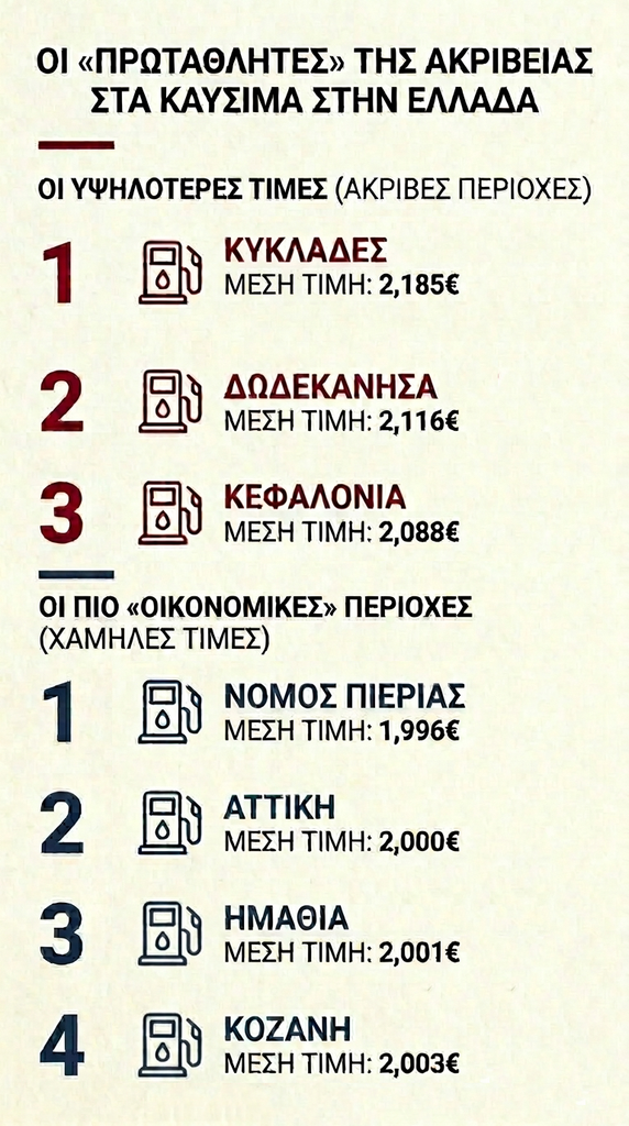 Οι «πρωταθλητές» της ακρίβειας: Οι Κυκλάδες κρατούν τα σκήπτρα με την αμόλυβδη στο εξωφρενικό 2,185€ και το diesel κίνησης να ξεπερνά ακόμα και την τιμή της βενζίνης στην Αθήνα, φτάνοντας το 2,140€. Ακολουθούν τα Δωδεκάνησα (2,116€) και η Κεφαλονιά (2,088€).