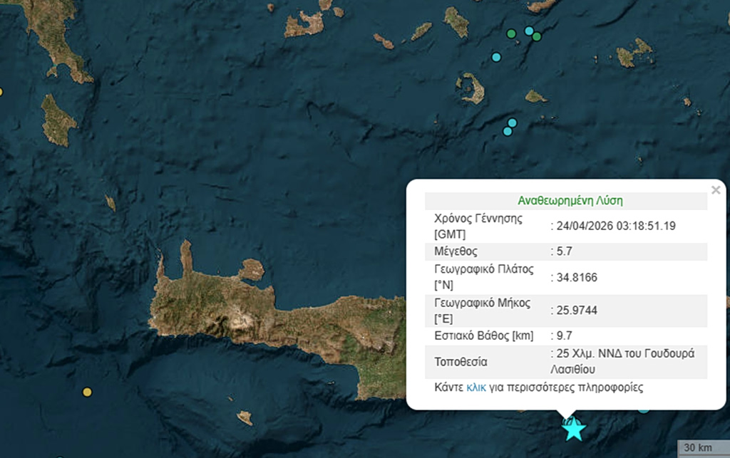 Σεισμός 5,7 Ρίχτερ σημειώθηκε λίγο μετά τις 03:00 τα ξημερώματα στην Κρήτη, προκαλώντας ανησυχία στους κατοίκους του νησιού. Σύμφωνα με το Γεωδυναμικό Ινστιτούτο, το επίκεντρο εντοπίστηκε επτά χιλιόμετρα βορειοδυτικά του Γουδουρά Λασιθίου, ενώ το εστιακό βάθος υπολογίστηκε στα πέντε χιλιόμετρα.