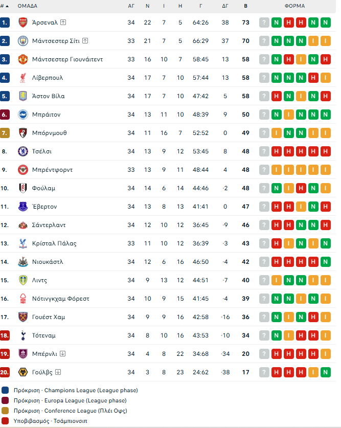 Η Βαθμολογία της Premier League