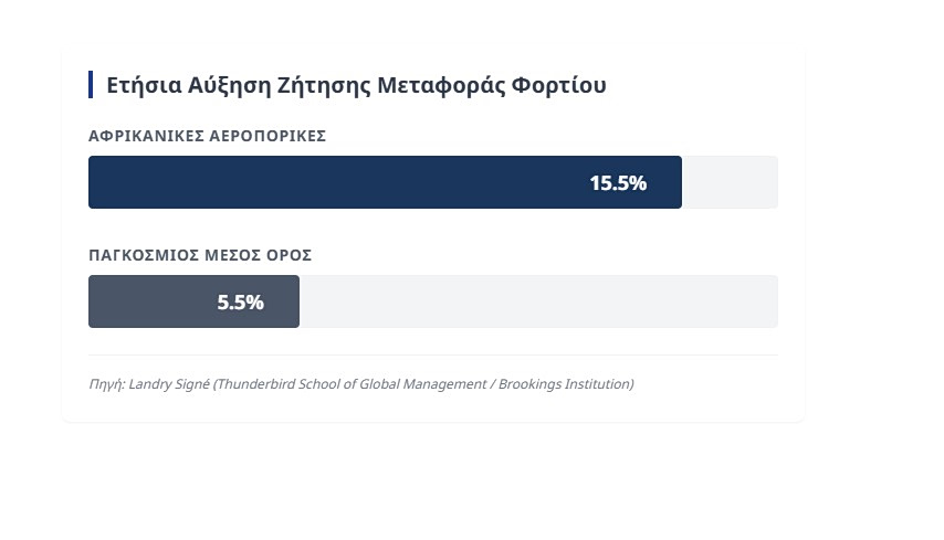 Ο Landry Signé, εκτελεστικός διευθυντής στη Thunderbird School of Global Management του Πανεπιστημίου της Αριζόνα και senior fellow στο Brookings Institution, τόνισε ότι οι αφρικανικές αεροπορικές εταιρείες καταγράφουν τη μεγαλύτερη αύξηση στη ζήτηση μεταφοράς φορτίου παγκοσμίως, με άνοδο 15–16% ετησίως, έναντι παγκόσμιου μέσου όρου 5,5%.