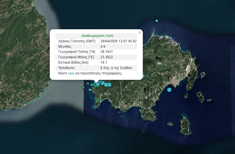 Υπενθυμίζεται ότι την Τρίτη (28/4), 14:12 ώρα Ελλάδας, σημειώθηκε σεισμός μεγέθους 4,7 βαθμών της κλίμακας Ρίχτερ, επίσης στο νησί της Σκιάθου. Το επίκεντρο εντοπίστηκε σε απόσταση περίπου 8 χιλιομέτρων δυτικά της Σκιάθου.