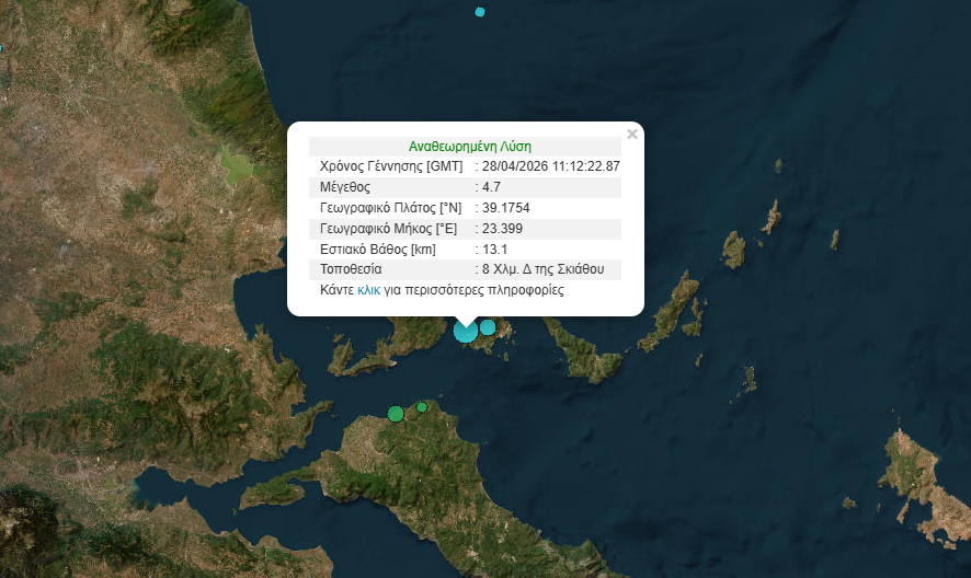 Σεισμική δόνηση μεγέθους 4,7 βαθμών της κλίμακας Ρίχτερ σημειώθηκε στις 14:12 ώρα Ελλάδας, σύμφωνα με τα δεδομένα του Γεωδυναμικού Ινστιτούτου. Το επίκεντρο εντοπίστηκε σε απόσταση περίπου 8 χιλιομέτρων δυτικά της Σκιάθου.