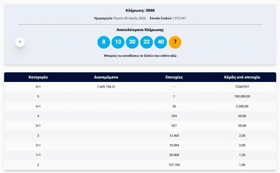 Πραγματοποιήθηκε το βράδυ της Πέμπτης (30/4) η κλήρωση 3060 του Τζόκερ που μοιράζει στην πρώτη κατηγορία πάνω από 7,5 εκατ. ευρώ.