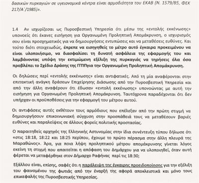 Τέλος, σε ένα άλλο σημείο του κειμένου σημειώνεται ότι: «Ο παραιτηθείς αρχηγός της Αστυνομίας στην ίδια συνέντευξη Τύπου δήλωσε ότι “στις 18.25 έχουμε το πρώτο πέρασμα στην άλλη πλευρά της Λεωφόρου Μαραθώνος”, άρα για ποια λήψη προληπτικού μέτρου απομάκρυνσης γίνεται λόγος εκείνη τη στιγμή, όταν αυτή μεταφέρθηκε στον δήμαρχο Ραφήνας στις 18.30. Εξάλλου είναι σαφές ότι η παράλειψη της έγκαιρης προειδοποίησης για την εξέλιξη του φαινομένου της φωτιάς από την έναρξή της αφορά αποκλειστικά και μόνο τους επικεφαλής της Πυροσβεστικής». Για να συμπληρωθεί στη συνέχεια: «Στο σημείο αυτό μας δημιουργεί απορία το γεγονός γιατί δεν ενημερωθήκαμε επίσημα από την Πυροσβεστική Υπηρεσία ότι η φωτιά καίει στην Καλλιτεχνούπολη προς Διώνη, νωρίτερα από τις 6.07 μ.μ., όταν μας εστάλη το γραπτό μήνυμα για συνδρομή με μηχανήματα έργου και υδροφόρες».