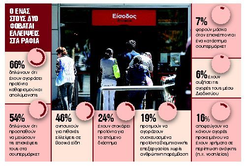 «Πόρτα» στην είσοδο των σουπερμάρκετ της χώρας ώστε να μην υπάρχει συνωστισμός εντός των καταστημάτων με στόχο την αποτροπή εξάπλωσης του κορωνοϊού επιβάλλει η κυβέρνηση ενώ ξεκίνησε ήδη την καταγραφή όλων των ποιοτήτων αντισηπτικών και μασκών που υπάρχουν στην αγορά στο πλαίσιο του ελέγχου για την αποφυγή κερδοσκοπικών φαινομένων. Την ίδια ώρα ο πανικός και η ανησυχία έχουν επηρεάσει την καταναλωτική συμπεριφορά των Ελλήνων με καταστήματα να μη σταματούν να γεμίζουν τα ράφια τους κυρίως με τρόφιμα μακράς διάρκειας και απολυμαντικά προϊόντα.