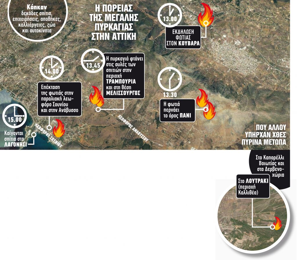 Σπίτια, επιχειρήσεις, αποθήκες και αυτοκίνητα παραδομένα στις φλόγες. Ζώα που εγκλωβίστηκαν άφησαν την τελευταία τους πνοή. Πολλοί άνθρωποι σε Κέντρα Υγείας λόγω αναπνευστικών προβλημάτων. Κάτοικοι να προσπαθούν με κάθε μέσο να προστατεύσουν τις περιουσίες τους. Καταγγελίες για έλλειψη πυροσβεστικών οχημάτων και προβλήματα στον συντονισμό. Η πρώτη ημέρα που συνδυάστηκαν υψηλές θερμοκρασίες και δυνατοί άνεμοι είχαν σαν αποτέλεσμα να ξεσπάσουν δεκάδες πυρκαγιές σε διάφορες περιοχές της χώρας με τις πιο σημαντικές από αυτές να εκδηλώνονται στον Κουβαρά Αττικής, στο Λουτράκι, στο Καπαρέλλι Βοιωτίας και στα Δερβενοχώρια.