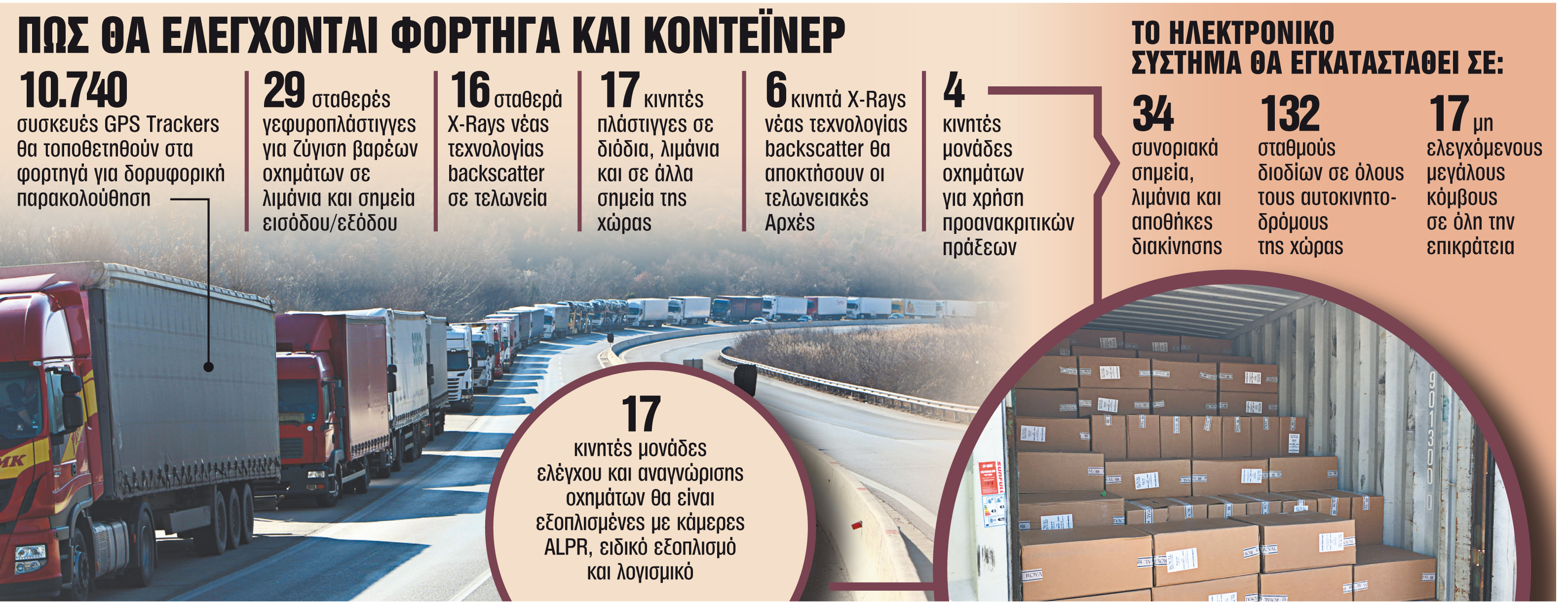 Τα φορτηγά μεταφοράς εμπορευμάτων και τα εμπορευματοκιβώτια που διακινούνται θα εφοδιαστούν με συστήματα GPS Trackers και η κυκλοφορία τους θα ελέγχεται μέσω δορυφόρου, αλλά και άλλων συστημάτων που θα εγκατασταθούν στη χώρα. Με το σύστημα αυτό, οι ελεγκτικοί μηχανισμοί της ΑΑΔΕ θα παρακολουθούν online τη διακίνηση των αγαθών σε όλα τα στάδια.