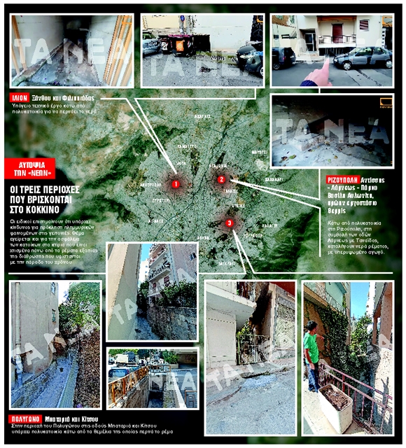 Τρία είναι τουλάχιστον τα σημεία σε γειτονιές της Αθήνας με ανοιχτά ρέματα, τα οποία εντοπίζει η ομάδα «Γεωμυθική» να περνούν κάτω από πολυκατοικίες, απειλώντας άμεσα τους κατοίκους και τις περιουσίες τους, τόσο εξαιτίας της αναπόφευκτης διάβρωσης των υλικών κατασκευής των κτισμάτων που βρίσκονται ακριβώς από πάνω όσο και λόγω αυξημένου κινδύνου πλημμυρικών φαινομένων, σε περίπτωση έντονης βροχόπτωσης, που θα αντιμετωπίσει ολόκληρη η γύρω περιοχή από την υπερχείλιση των ρεμάτων. Στο κανάλι της ομάδας (η οποία συστάθηκε το 2006 με στόχο, μεταξύ άλλων, την τεκμηρίωση τοπογραφίας γεωγραφικών περιοχών και υδάτινων ρευμάτων σε διάφορες χρονικές περιόδους) στο Youtube, ένα από τα μέλη της, ο 42χρονος αγρονόμος και τοπογράφος – μηχανικός Δημήτρης Θεοδοσόπουλος – που συνόδευσε «ΤΑ ΝΕΑ» σε αυτοψία στο μεγαλύτερο, κάτω από πολυκατοικία, ανοιχτό ρέμα μήκους 200 μέτρων, το οποίο διατρέχει 3 οικοδομικά τετράγωνα στο Πολύγωνο και επηρεάζει τουλάχιστον 20 κατοικίες – καταγράφεται να πραγματοποιεί οδοιπορικά σε αντίστοιχα ανοιχτά ρέματα σε Ριζούπολη και Ιλιον. Οπως σημειώνει ο ίδιος, πρόκειται για καταστάσεις που η πραγματικότητα ξεπερνά τη φαντασία.