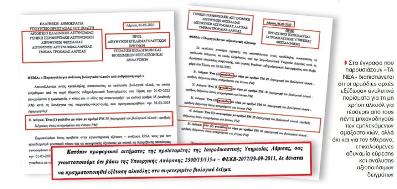 Σε επικοινωνία των «ΝΕΩΝ» με στελέχη της Ιατροδικαστικής Υπηρεσίας Λάρισας που προχώρησε στη λήψη δειγμάτων από τις σορούς των θυμάτων αναφέρθηκε ότι «δεν υπήρχε η δυνατότητα λήψης αίματος από τον 59χρονο γιατί δεν το επέτρεπε η κατάσταση της σορού του, καθώς από τη σφοδρότητα της σύγκρουσης είχε εξαγγειωθεί» (πλήρης απώλεια αίματος). Οσον αφορά το φιαλίδιο που είχε σταλεί λίγες ημέρες νωρίτερα στην ΕΛ.ΑΣ., υποστηρίχθηκε ότι «πιθανόν αφορούσε πολύ μικρή ποσότητα αίματος που συγκεντρώθηκε μόνο για την εξέταση DNA και δεν μπορούσε να βρεθεί μεγαλύτερη για επαρκή έρευνα για χρήση αλκοόλ».