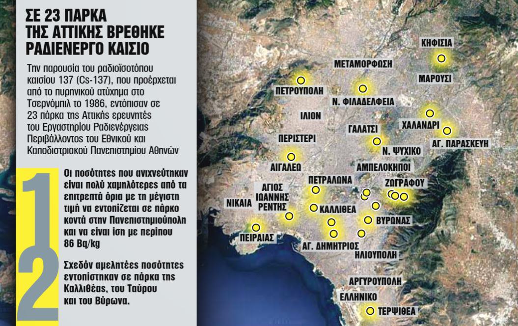 Οπως αποκαλύπτει έρευνα του Εργαστηρίου Ραδιενέργειας Περιβάλλοντος του Εθνικού Καποδιστριακού Πανεπιστημίου Αθηνών, σε 23 πάρκα του Λεκανοπεδίου διαπιστώθηκε η παρουσία καισίου 137 (Cs-137), που αποτελεί ένα από τα συνηθέστερα προϊόντα σχάσης του ουρανίου.