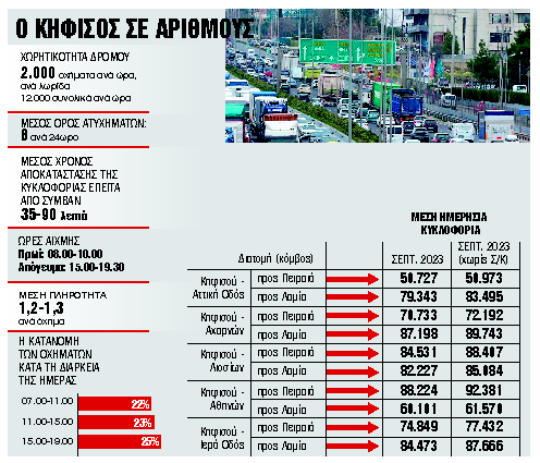 Αν και διαθέτει – σχετικά – μεγάλη χωρητικότητα, η συσσώρευση των μετακινήσεων σε συγκεκριμένες ώρες και σημεία σε συνδυασμό με τον τεράστιο αριθμό των οχημάτων που τον διέρχονται καθημερινά, δημιουργούν τεράστιες ουρές. «Τα περισσότερα αυτοκίνητα διέρχονται τον Κηφισό από τις 08.00 μέχρι τις 09.30-10.00 το πρωί και το απόγευμα από τις 15.00 μέχρι τις 19.30», λέει χαρακτηριστικά ο Κωνσταντίνος Κεπαπτσόγλου. Σύμφωνα με τα στοιχεία του Κέντρου Διαχείρισης και Μελετών Κυκλοφορίας της Περιφέρειας Αττικής, τον Σεπτέμβριο η Μέση Ημερήσια Κυκλοφορία (ΜΗΚ) στον κόμβο Λεωφόρου Κηφισού – Λιοσίων έφτασε τα 166.758 αυτοκίνητα και στα δύο ρεύματα.