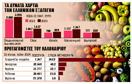 Από τα τελευταία διαθέσιμα στοιχεία του Συνδέσμου Εξαγωγέων Φρούτων και Λαχανικών για το διάστημα Ιουλίου 2023-Ιουλίου 2024 προκύπτει ότι οι εξαγωγές ροδάκινων αυξήθηκαν κατά 23,6%, των κερασιών κατά 32,1%, των νεκταρινιών κατά 40,2%, των βερίκοκων κατά 3,6% και των επιτραπέζιων σταφυλιών κατά 324,2%, αν και οι εξαγώγιμες ποσότητες ήταν μικρές. Αυξημένες κατά 32,84% ήταν οι εξαγωγές πατάτας, φτάνοντας τους 101.329 τόνους, έναντι 76.278 τόνων το 2023. Για τους έλληνες παραγωγούς και εξαγωγείς η διείσδυση χωρών εκτός της ΕΕ στις αγορές-στόχους για τα ελληνικά προϊόντα αποτελεί τον μεγαλύτερο κίνδυνο. Μάλιστα, η έμφαση στην εγχώρια παραγωγή, η δημιουργία προστιθέμενης αξίας και η προβολή της ποιότητας των ελληνικών προϊόντων είναι η σωστή στρατηγική, σύμφωνα με τον Σύνδεσμο Εξαγωγέων Φρούτων και Λαχανικών, για την περαιτέρω αύξηση των εξαγωγών και τη θωράκιση των υπαρχουσών αγορών.