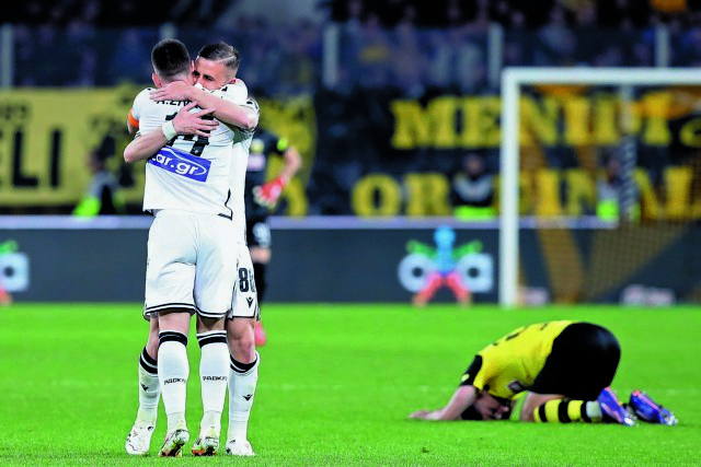 Ο ΠΑΟΚ που δεν είχε νίκη σε ντέρμπι φέτος και ποτέ διπλό στην «Αγια-Σοφιά», τα έκανε όλα μαζεμένα και μάλιστα με τρόπο εντυπωσιακό. Βρέθηκε πίσω στο σκορ με δύο γκολ στο 47′ από την ΑΕΚ, αλλά έφερε τούμπα το ματς με τρομερή αντεπίθεση παίρνοντας τη νίκη με 3-2 στην πρεμιέρα των πλέι οφ και μπαίνει πλέον για τα καλά στο κόλπο της δεύτερης θέσης. Ολα άλλαξαν στο 58′ όταν ο Κωνσταντέλιας μείωσε με εξαιρετικό γκολ και γύρισε, όπως αποδείχθηκε, την ψυχολογία του ματς αν και μέχρι εκείνη τη στιγμή η Ενωση ήταν κυρίαρχη. Και τώρα οι Κιτρινόμαυροι, που αποδοκιμάστηκαν έντονα στο φινάλε, είναι σε ακόμα πιο δύσκολη θέση μετά τη νέα καταστροφική ήττα κι ενώ ακολουθεί η ρεβάνς του Κυπέλλου με τον Ολυμπιακό.