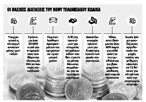 Πληρωμή ενοικίων αποκλειστικά μέσω τραπεζών από το 2026 με συνέπειες για ιδιοκτήτες και ενοικιαστές που δεν θα συμμορφωθούν, ενίσχυση των φορο-κινήτρων για έλληνες και ξένους που μετακομίζουν φορολογικά στην Ελλάδα, πρόστιμα έως 20.000 ευρώ για όσους δεν δέχονται άμεσες πληρωμές (IRIS) στις λιανικές συναλλαγές μέσω POS, επιβολή τέλους επιτηδεύματος έως 600 ευρώ για κάθε ακίνητο νομικού προσώπου το οποίο μισθώνεται για βραχυχρόνια μίσθωση αλλά και δεκαπλασιασμό προστίμων σε όσους διακινούν προϊόντα χωρίς παραστατικά φέρνει μεταξύ άλλων το νομοσχέδιο για τον Τελωνειακό Κώδικα που τέθηκε σε δημόσια διαβούλευση.