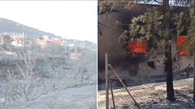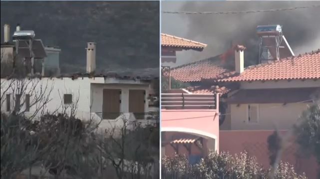 Σπίτια παραδόθηκαν στη φωτιά, ενώ κάτοικοι εγκατέλειπαν εσπευσμένα τις εστίες τους. Μαρτυρίες αλλά και εικόνες από το πεδίο επιβεβαιώνουν καταστροφές σε στέγες και αυλές, με το πύρινο μέτωπο να κινείται απειλητικά ανάμεσα σε οικισμούς.