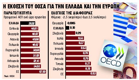 Η Ελλάδα κατατάσσεται στην τελευταία θέση και ως προς την αύξηση της παραγωγικότητας. Σύμφωνα με την έκθεση του ΟΟΣΑ, η παραγωγικότητα στην Ελλάδα είναι η χαμηλότερη σε πραγματικό ΑΕΠ ανά ώρα εργασίας, με δείκτη 38,82. Προηγούνται η Εσθονία με 46,8 και η Ουγγαρία με 48. Στην κορυφή βρίσκεται η Ιρλανδία με 131 και το Λουξεμβούργο με 107.