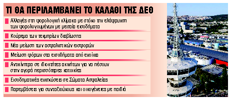 Ετσι, ο λογαριασμός για τις παροχές που θα περιλαμβάνει το πακέτο της ΔΕΘ έχει φτάσει σε 1,5 δισ. ευρώ, ποσό το οποίο εκτιμάται ότι μπορεί να αυξηθεί στα επίπεδα των 2 δισ. ευρώ. Στο «καλάθι» θα χωρέσουν μειώσεις άμεσων φόρων με αλλαγές στη φορολογική κλίμακα, νέα μείωση των ασφαλιστικών εισφορών, «κούρεμα» τεκμηρίων αλλά και κίνητρα και αντικίνητρα για τους ιδιοκτήτες ακινήτων με στόχο την αντιμετώπιση της στεγαστικής κρίσης.