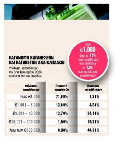Μια χώρα με μεγάλες και διευρυνόμενες οικονομικές ανισότητες δείχνουν τα στοιχεία του Ταμείου Εγγύησης Καταθέσεων και Επενδύσεων (ΤΕΚΕ) για την κατανομή των καταθέσεων. Σύμφωνα με την απολογιστική έκθεση του ΤΕΚΕ για το 2024, σχεδόν τα μισά χρήματα (44,3% ή 92,5 δισ. ευρώ) που υπάρχουν στις τράπεζες βρίσκονται σε λογαριασμούς με υπόλοιπο άνω των 100.000 ευρώ που ανήκουν στο 0,8% των καταθετών (περίπου 250.000 καταθέτες).