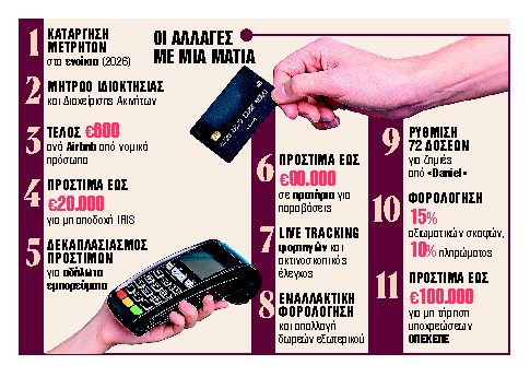 1. Κατάργηση μετρητών στα ενοίκια. Από το 2026, όλα τα μισθώματα (εκμισθώσεις ή υπεκμισθώσεις) θα καταβάλλονται υποχρεωτικά μέσω τραπεζικού λογαριασμού του εκμισθωτή που δηλώνεται στην ΑΑΔΕ. Σε περίπτωση μη καταβολής του μισθώματος ηλεκτρονικά: