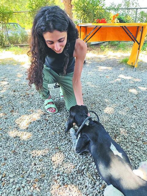 Η Hivvi, γερμανίδα τουρίστρια, με τη σκυλίτσα Dotty που υιοθέτησε από το κυνοκομείο της Χαλκίδας