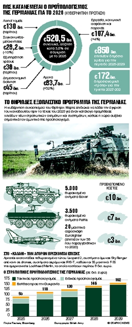 Ο πόλεμος του Πούτιν στην Ουκρανία έφερε, λοιπόν, τον ραγδαίο επανεξοπλισμό της Γερμανίας. Ο προϋπολογισμός του γερμανικού υπουργείου Αμυνας για το 2026, που σχεδιάζεται αυτό το διάστημα, αναμένεται να αυξηθεί σε συνολικά περίπου 82,7 δισεκατομμύρια ευρώ. Μαζί με τις προγραμματισμένες δαπάνες ύψους περίπου 25,5 δισεκατομμυρίων ευρώ από το πρώτο Ειδικό Ταμείο της Μπούντεσβερ, οι γερμανικές ένοπλες δυνάμεις θα έχουν στη διάθεσή τους περισσότερα από 108 δισεκατομμύρια ευρώ το επόμενο έτος. Η Γερμανία καλύπτει έτσι τον νατοϊκό στόχο 2% αμυντικές δαπάνες και με το νέο Ειδικό Ταμείο θα ανταποκριθεί και στον στόχο του 5% του ΑΕΠ από το 2035.